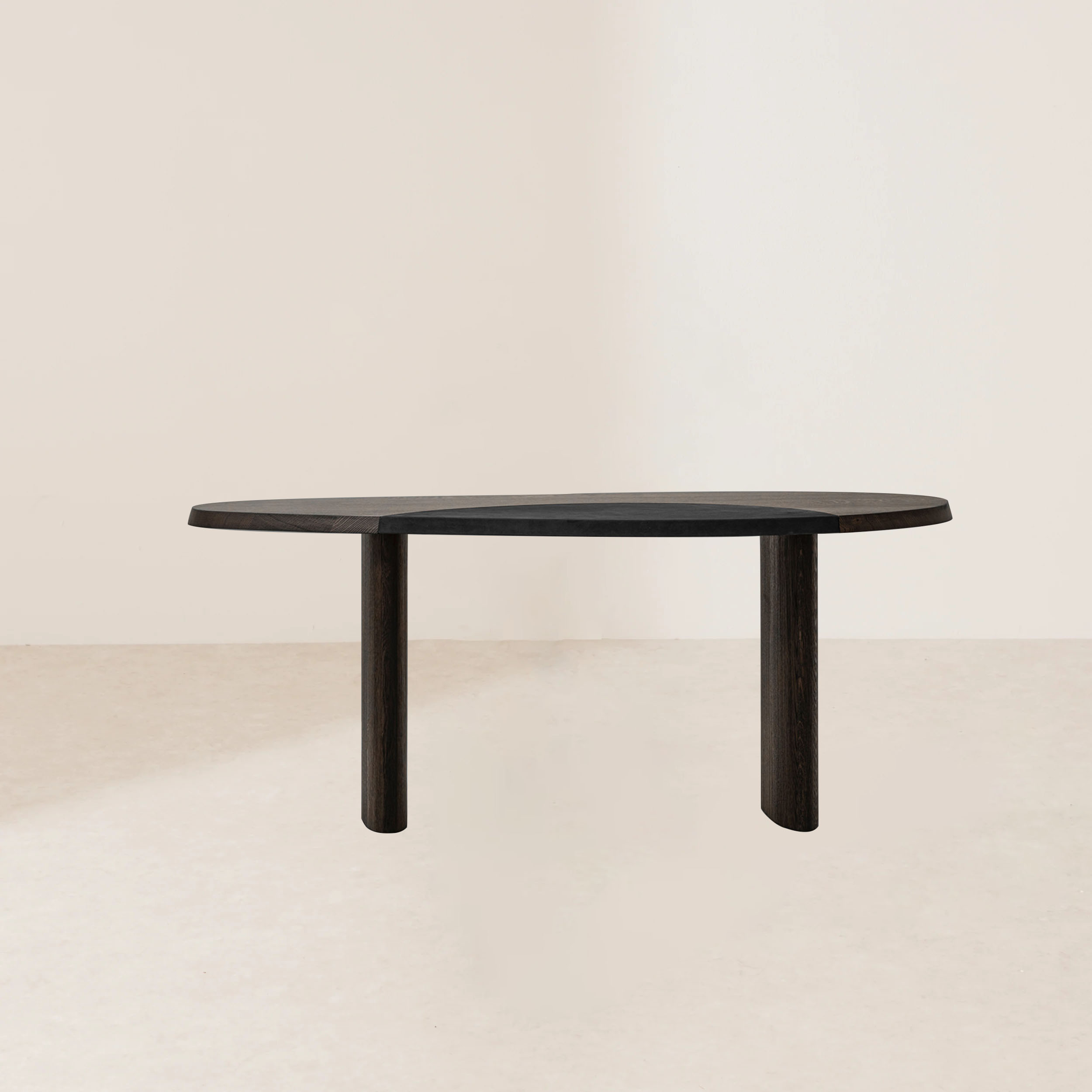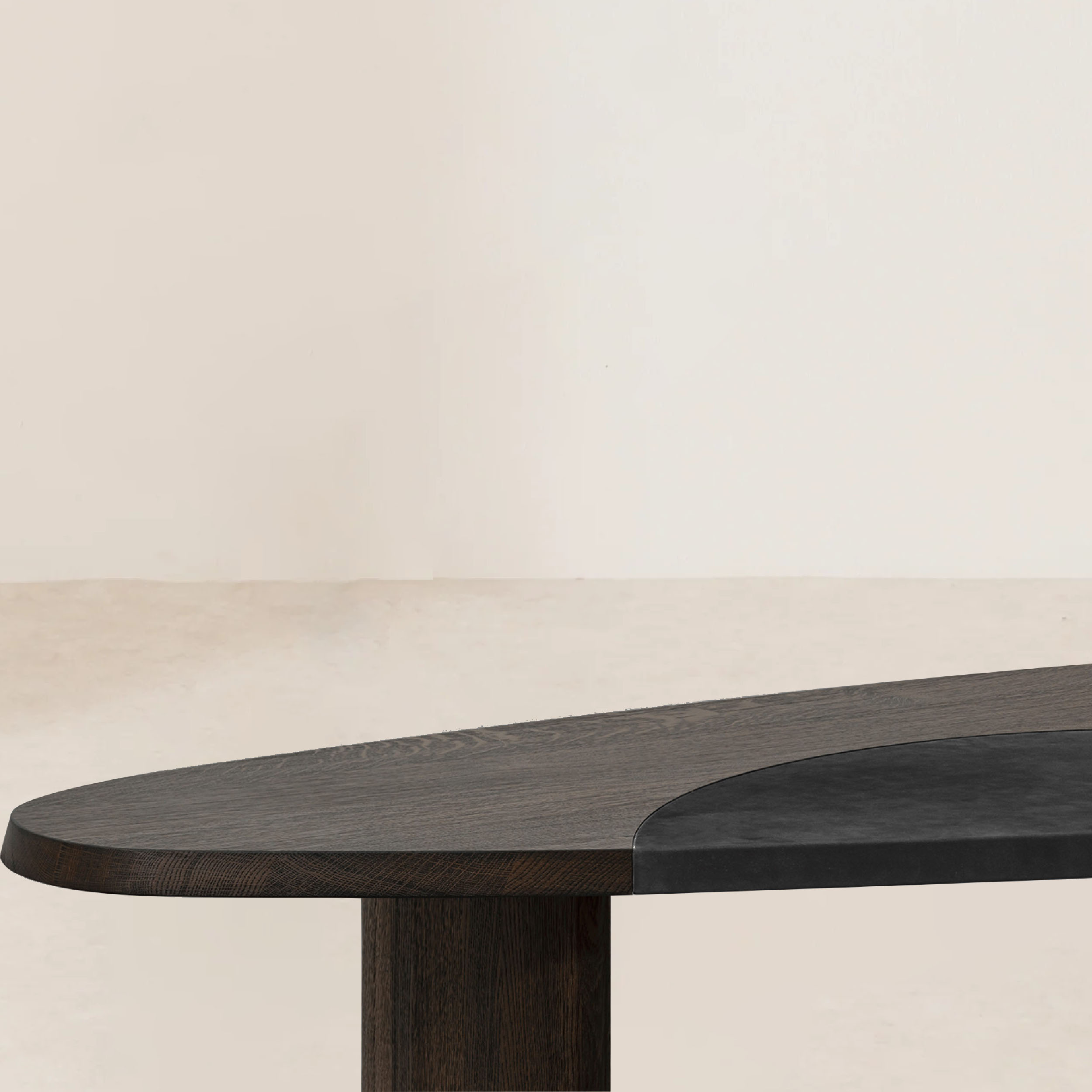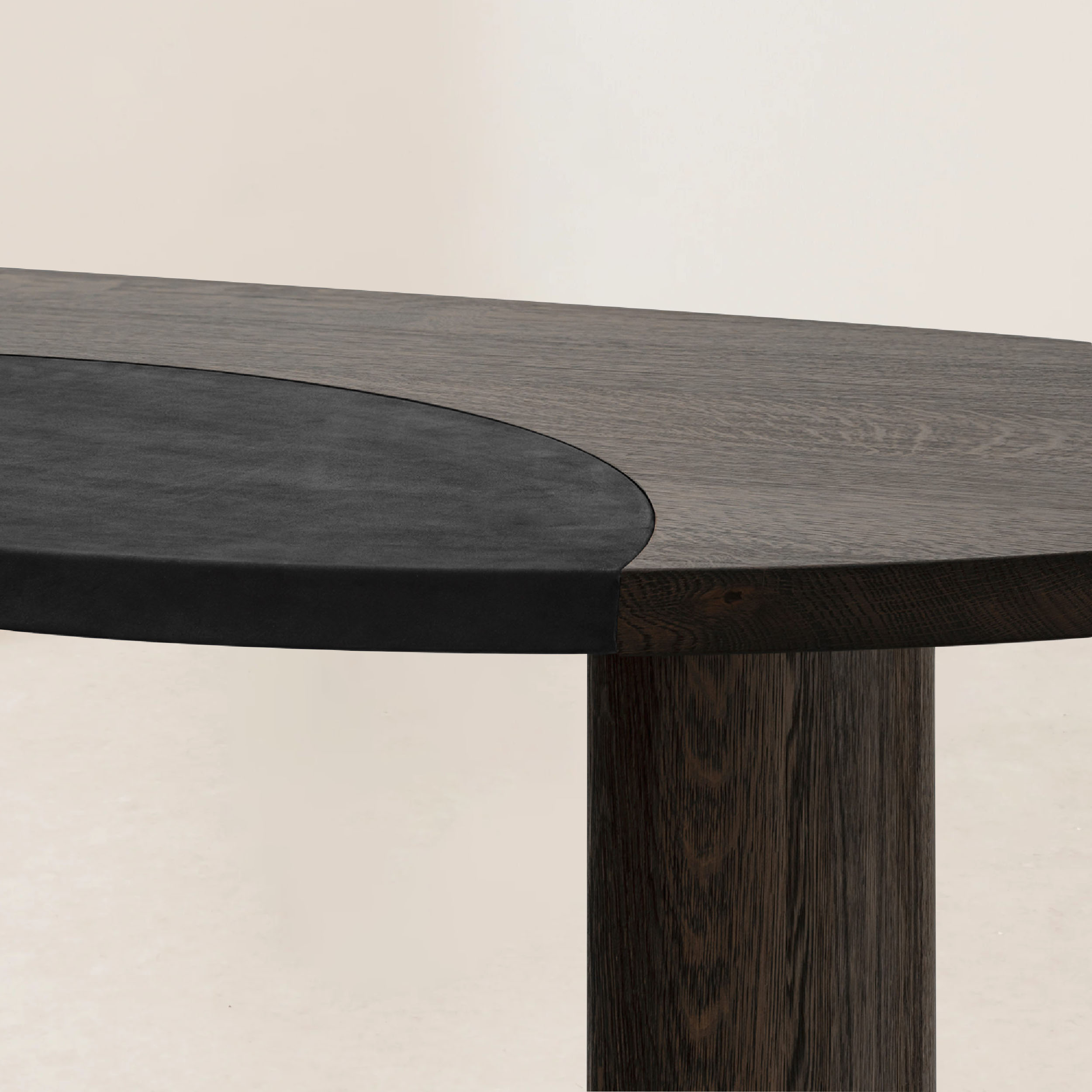 Crafted with a sturdy European oak frame, this coffee table showcases a beautiful contrast between its robust support and the supple leather surface. Designed with clean lines and minimalist aesthetics, it offers a spacious and functional workspace for various tasks. The chamfered wooden top, optionally available with a leather inlay, is cantilevered over cylindrical legs, adding a modern twist to its timeless design. Inspired by Charlotte Perriand’s tables en forme libre, this coffee table fosters creative use and encourages free-flowing conversations, embodying a space where ideas flourish without restriction. Its durable construction ensures longevity, while the smooth leather finish adds a touch of sophisticated elegance.